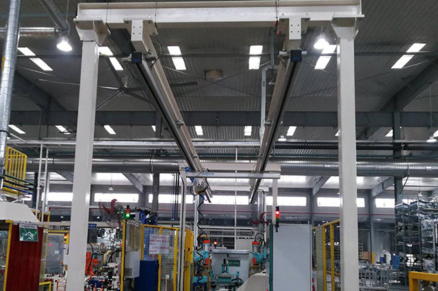 推介產品:AREKE組合式懸掛起重機(鋁制主梁),智能型提升裝置 解決難題:客戶之前在該工位使用過氣動...