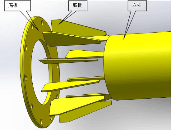 將立柱套入底板的內圈中,在底板的兩側將底板與立柱焊接固定,再將若干筋板焊接于底板和立柱上,完成立柱懸臂吊底板安裝。